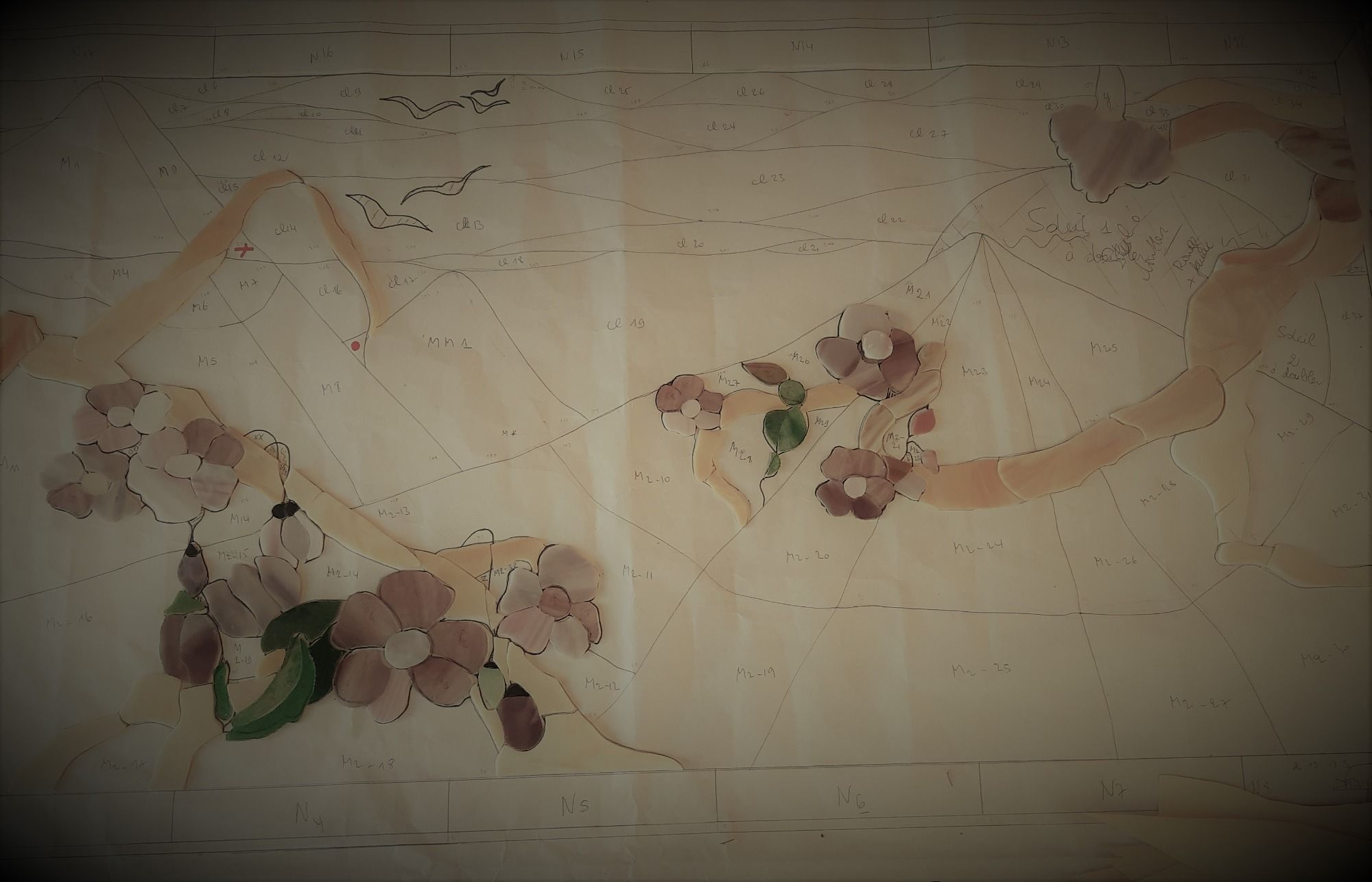 Sur une base de rectangles transparents à matière, un bouquet en son centre. Tout le décor est peint.